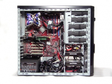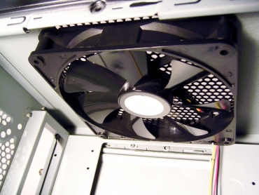 Aušinimo sistema tikrai efektyvi. Naudojant tik komplektuotus aušintuvus, kietųjų diskų temperatūra nukrito 5-7 laipsniai. CPU ventiliatoriaus atsisakiau iš viso, nes jis tik trukdė ir garsiai ūžė. Pilnai užtenka milžiniško 140 mm ventiliatoriaus, kabančio tiesiai virš CPU radiatoriaus.