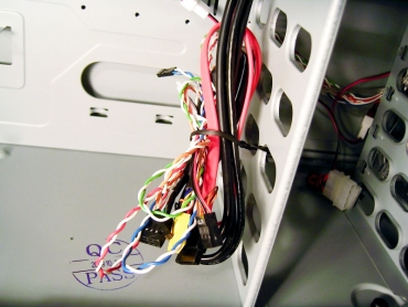 Tiek juodasis, tiek ir skaidrusis ventiliatoriai yra jungiami standartinėmis 4 pin Molex tipo jungtimis. Iš korpuso priekinės panelės ateina dar visa krūva laidų. Tai mygtukų, HDD ir power lempučių, audio ir USB jungčių kabeliai, eSATA duomenų laidas. Gaila, bet šie laidai nėra nei į ką nors įvilkti, nei supinti, nei sugrupuoti. Sujungus visus laidus į motininę plokštę tenka laidų perteklių slėpti kur papuola.