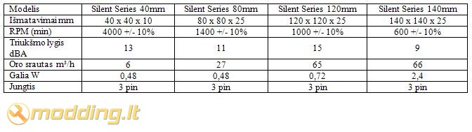 Visų Silent Series aušintuvų dizainas vienodas - juodas ventiliatoriaus rėmas bei baltas propeleris. Toks spalvų derinys atrodo tikrai gražiai. Visų ventiliatorių laidai įvilkti į juodą tinklelį. Naudojama 3 pin jungtis. Žemiau pateikiu ventiliatorių specifikacijų lentelę.