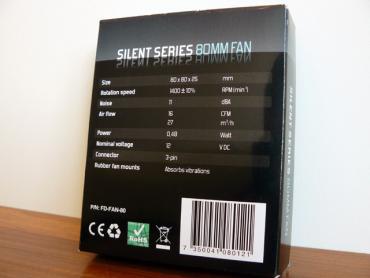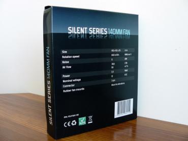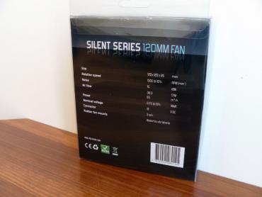 Silent Series ventiliatoriai supakuoti į permatomas pakuotes. Priekinėje jų dalyje matome ventiliatorių, nurodytas jo modelis bei RPM ir dBA. Kitoje pusėje pateikiamos detalesnės specifikacijos: nurodyti išmatavimai, oro srautas, galia bei jungties tipas.