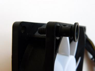 Silent Series 80 mm ventiliatorius veikdamas 1400 rpm greičiu skleidžia 11 dBA - tikrai geras santykis. Komplekte pridedami guminiai tvirtinimo elementai sumažins ventiliatoriaus į korpusą perduodamas vibracijas. Jos montuojamos naudojantis plonu atsuktuvu - guminis elementas įstatomas iš išorinės korpuso pusės bei įstumiamas į vintiliatorių. Mano nuostabai - toks tvirtinimas ganėtinai tvirtai laiko ventiliatorių.
