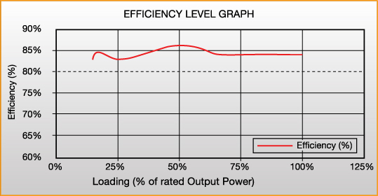Grafike pavaizduota maitinimo bloko efektyvumo priklausomybė nuo jo apkrovos. Kaip matome - efektyvumas nenusileidžia iki žemesnės nei 82 % ribos net maksimaliai jį apkrovus. Esant 50 % apkrovai efektyvumas siekia ~87 %.