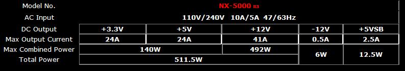 Nexus NX-5000 R3 - tai 530 W galingumo maitinimo blokas, kuris atitinka 80Plus Bronze standartų reikalavimus ir jo efektyvumas viršyja 82%. Šis modelis yra vienas naujausių NX modelių. Jo konstrukcija patobulinta, todėl dabar PSU yra mažesnių išmatavimų, o Real Silent 120mm ventiliatorius, skleidžiantis vos 15.5 dBA, turėtų užtikrinti tylų maitinimo bloko veikimą.
