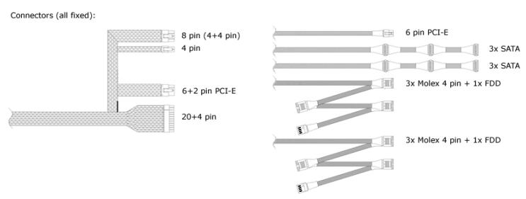 Maitinimo blokas komplektuojamas su nemažu laidų kiekiu, kurie negali būti pasirinktinai atjungiami. Visi laidai įvilkti į juodai-baltą tinklelį, kištukai pakeisti juodais. Laidai ilgi, todėl įrenginius be vargo pasieks net ir Full tower tipo korpusuose.