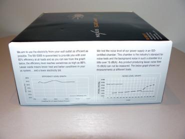 Nexus NX-5000 R3 maitinimo blokas supakuotas dėžėje, ant kurios pateikiama visa pagrindinė informacija apie šį PSU: priekinėje dalyje pavaizduotas maitinimo blokas, galinėje dalyje aprašomos maitinimo bloko ypatybės, nurodytos charakteristikos bei jungčių sąrašas. Šoninėse dėžės dalyse - maitinimo bloko apkrovos/efektyvumo grafikas bei ventiliatoriaus skleidžiamų dBA priklausomybė nuo PSU apkrovos.