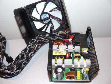 Radiatoriai aliumininiai, prie pagrindo ištisiniai, nedideli. Panaudotas vienas kondensatorius bei du transformatoriai. PSU rėmas šiek tiek per liaunas - greičiausiai panaudotas minkštas metalas, o gal būt jis tiesiog per plonas. Tačiau kaip bebūtų - tai minusas, nes surenkant PSU gali kilti šiokių tokių nepatogumų.