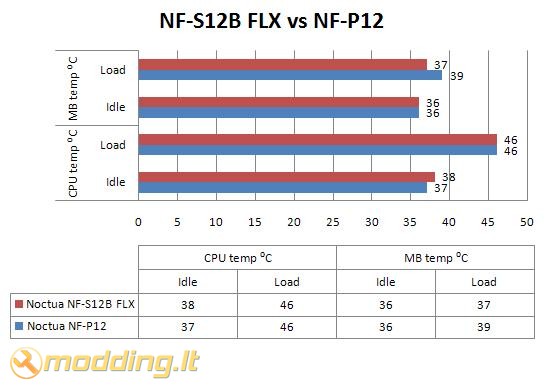 NF-S12B FLX ventiliatorius vos vienu laipsniu nusileidžia NF-P12 aušintuvui Idle rėžime, tačiau tuo pačiu jis veikia 80rpm mažesniu greičiu bei skleidžiai kiek mažesnį dBA lygį. Load rėžimuose CPU temperatūros nesiskyrė. Lyginant MB temperatūras, Idle rėžime jos buvo vienodos, o Load rėžime NF-S12B FLX ventiliatorius 2 ⁰C rodo žemesnę temperatūrą. Taip ir turėtų būti, nes NF-S12B FLX ventiliatorius turi didesnį oro srautą - 100.6 m³/h, tuo tarpu NF-P12 - 92.3 m³/h.
