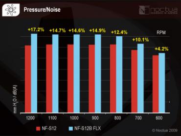 Veikdamas 1200rpm rėžime, NF-S12B FLX ventiliatorius pasiekia 18% geresnį oro srautą bei 14% geresnį spaudimą nei NF-S12. Tuo pačiu veikia tyliau, nes sukasi 100rpm mažesniu greičiu.