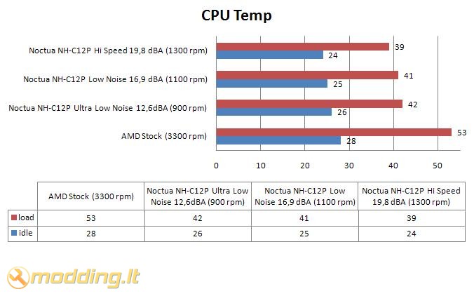 Noctua NH-C12P aušintuvo rezultatai labai geri: veikdamas Ultra Low Noise 12,6 dBA rėžime jis 2 laipsniais Idle bei 11 laipsnių laimi prieš AMD Stock aušintuvą. Veikdamas Low Noise 16,9 dBA rėžime NH-C12P aušintuvas laimi 3 laipsniais Idle bei 12 laipsnių Load rėžime. Veikdamas be adapterių, 1300rpm bei 19,8 dBA rėžime aušintuvas NH-C12P 4 laipsniais Idle ir net 14 laipsnių rodo geresnius rezultatus nei AMD Stock aušintuvas.