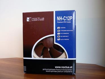 Noctua NH-C12P pakuotė tikrai įspūdingo dydžio - tai didžiausia procesoriaus aušintuvo pakuotė kurią man teko matyti. Pakuotėje yra permatomi langeliai, pro kuriuos matome radiatorių bei NF-P12 ventiliatorių. Ant aušintuvo pakuotės pateikiama daug infomracijos: piekinėje pakuotės dalyje nurodytos pagrindinės aušintuvo ypatybės, šoninėse dalyse - montavimo schemos AM2 bei LGA platformoms, aušintuvo geometriniai parametrai bei NF-P12 9-Blade ventiliatoriaus Vortex-Control Notches technologijos ypatumai, Quad Core Ready užrašas. Viršutinėje dalyje nurodytos pagrindinės radiatoriaus bei ventiliatoriaus specifikacijos. Galinėje pakuotės dalyje randame produkto aprašymą šešiomis užsienio kalbomis. Taipogi randame Noctua produktų apdovanojimų sąrašą, kuriuos suteikė tokie kompiuterinės technikos apžvalgų puslapiai kaip bit-tech ar 3dgameman.