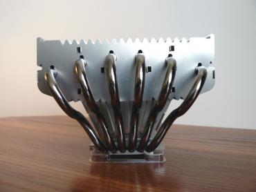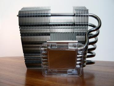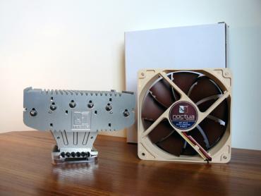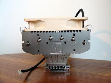 Priekinėje aušintuvo dalyje matome Noctua įspaustą logotipą. Radiatoriaus šonuose yra grioveliai rėmeliams, kurie skirti ventiliatoriaus tvirtinimui. Radiatoriaus paviršius, kuriuo jis montuojamas prie procesoriaus, nėra nupoliruotas iki veidrodinio spindesio. Jis tarsi su nedideliais, viena kryptimi orentuotais, grioveliais. Taipogi negalima nepastebėti plokštelių kraštų dantytumo.