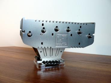 Paimame aušintuvą ir prie jo apačios prisukame dvi tvirtinimo "auseles". Ant tvirtinimo detalių, kurias sumontavome ant motininės plokštės, dedamos raudonos tarpinės bei prisukami 4 varžtai.