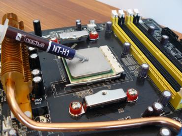 Ant procesoriaus užtepame termopastą. Jei termopastos užtepsite per daug - gali pablogėti šilumos perdavimas. Termopastos reiktų dėti 4-5mm diametro lašą. Gamintojas rekomentuoja termopastos lašą prispausti aušintuvu bei pasukinėti aušintuvą į abi puses nedideliu kampu - taip termopasta vienodai paskirstoma ant paviršiaus.