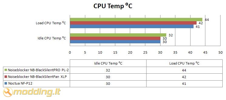 NB-BlackSilentPRO PL-2 ventiliatoriaus rezultatai nusileido NB-BlackSilentFan XLP rezultatams 2 ⁰C tiek Idle, tiek Load rėžimuose. Šio ventiliatoriaus charakteristikos ir koplektacija yra labiau specializuota jį naudoti kaip korpuso aušintuvą.