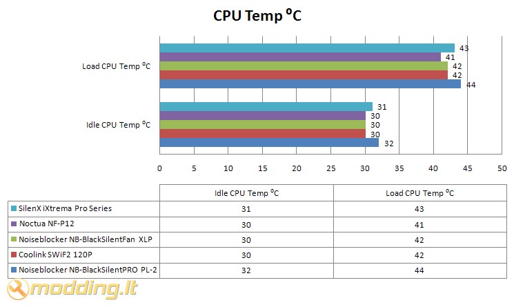 Testuose palygintos CPU temperatūros aušinant jį Noctua NH-U12P SE2 aušintuvu naudojant vieną SilenX IXTREMA Pro Series 120mm, vieną SWiF2 120P ventiliatorių, vieną NB-BlackSilentPRO PL-2, vieną NB-BlackSilentFan XLP arba vieną Noctua NF-P12 ventiliatorių. Visų ventiliatorių apsukos nustatytos 1000 rpm panaudojus Noiseblocker NB-Fanspeed Controller.