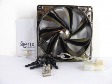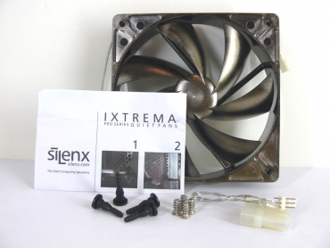 SilenX IXTREMA Pro Series 120mm ventiliatorius nudažytas rudai-sidabrine spalva, jo rėmas standartinis kaip ir visų ventiliatorių, tačiau rėme yra papildomos skylės - jų paskirtis man liko neaiški. Maitinimo laidas turi sidabrinės gumos apvalkalą, naudojamas 3 pin jungtukas. Komplekte pateikiamas papildomas adapteris, kuris leis ventiliatorių jungti prie 4pin Molex jungties. Komplekte taipogi pateikiami tvirtinimo varžtai: keturi geležiniai bei keturi guminiai tvirtinimo elementai, skirti vibracijų sumažinimui.